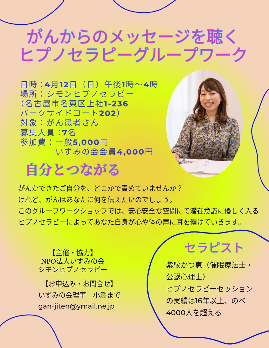 | イベント名 | がんからのメッセージを聴く ヒプノセラピーグループワーク |